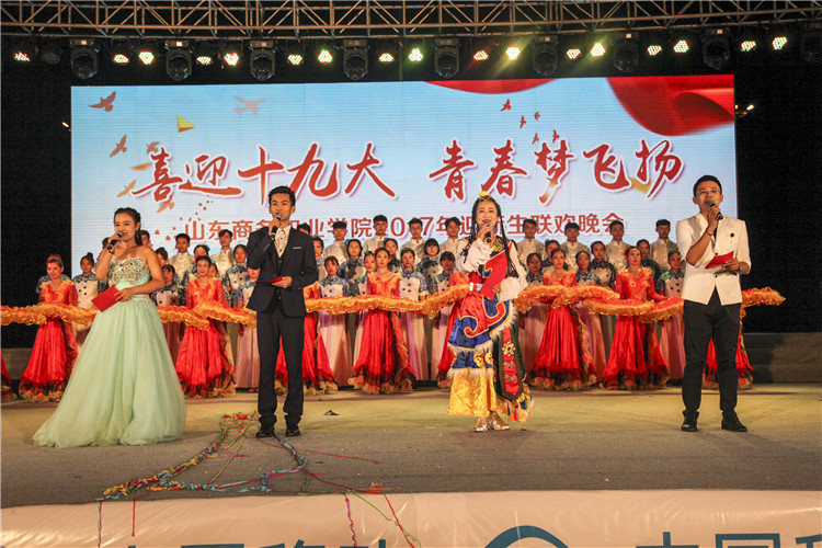 9月14日,山东商务职业学院中心大道一片欢乐的海洋,学校领导、社会各界嘉宾和2017级新生6000余人欢聚一堂,共同观看2017级迎新生联欢晚会“喜迎十九大,青春梦飞扬”。晚会现场,龙腾虎跃鼓乐团《盛世锣鼓》、独唱《好儿好女好江山》、舞蹈《年年有余》、集体朗诵《少年中国说》、烟台人民广播电台主持人刘丽老师和103位新生的倾情诵读诗《党的旗帜高高飘扬》、男女二重唱《共筑中国梦》等精彩主题节目轮番上演,为观众送上缤纷多彩的欢乐大餐,带来深深震撼与自豪感动,唱响了时代主旋律,展现了商务儿女斗志昂扬喜迎十九大,同走复兴路共筑中国梦的喜悦期盼之情。“党的十八大以来,我们真切感受到国强民富,风清气正,心中满满幸福感,我们永远心向党中央,在未来的五年我们要撸起袖子加油干,把我们的祖国建设的更加美好。”晚会现场一位教师激动说到。