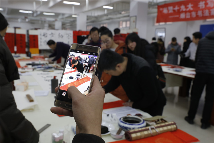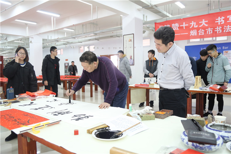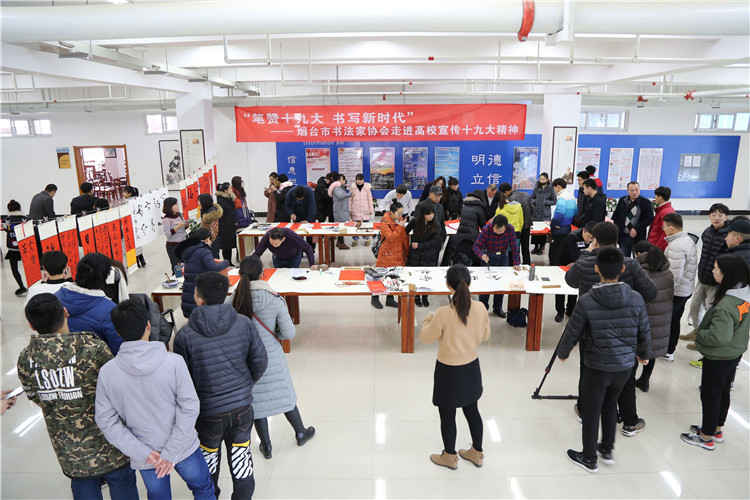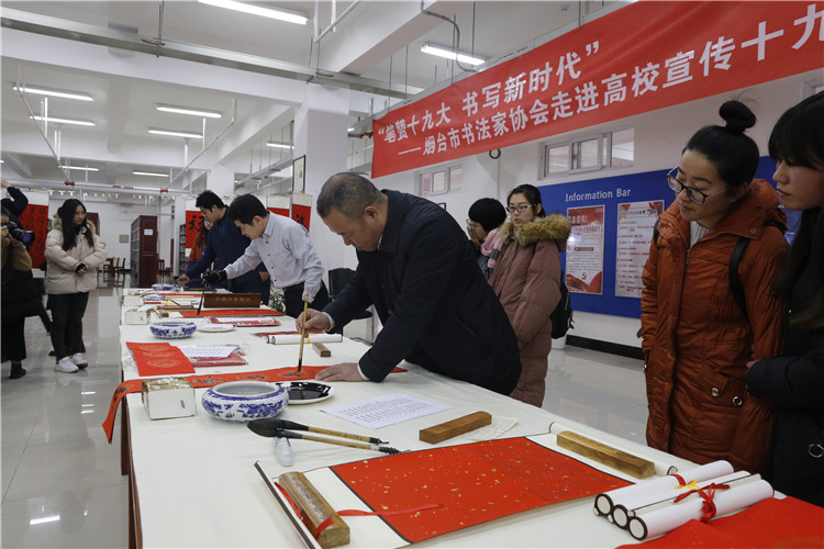 本站讯 2018年1月5日上午10时,我校图书馆二楼大厅翰墨飘香、丹青溢彩。一场以“笔赞十九大,书写新时代”为主题的书法活动在此举行。