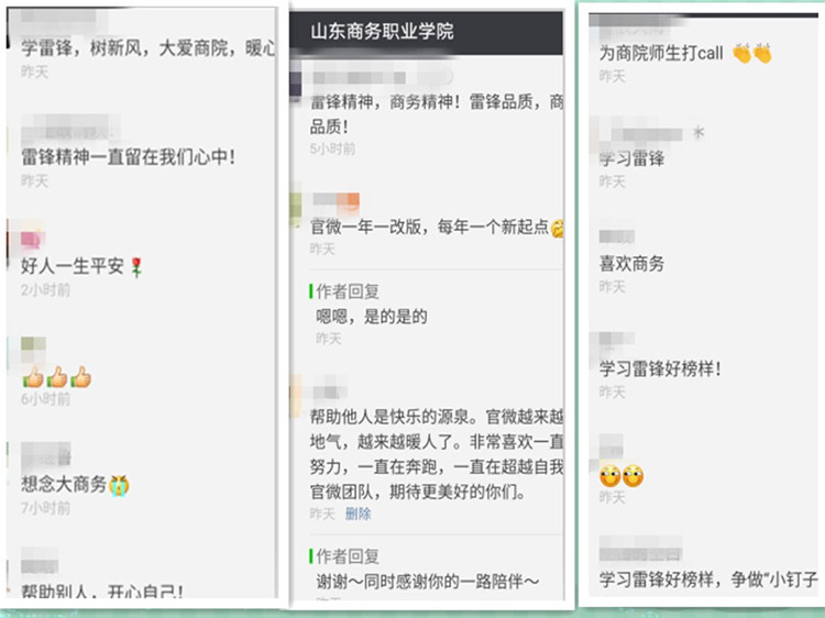 本站讯阳春三月,各高校纷纷掀起了学习雷锋、传播正能量的青年志愿者活动。在山东商务职业校园内,学校新媒体中心推送的身边小故事在师生朋友圈转载刷屏,不少网友直呼“被学校圈粉了”、“和商务一起,做好人好故事”。