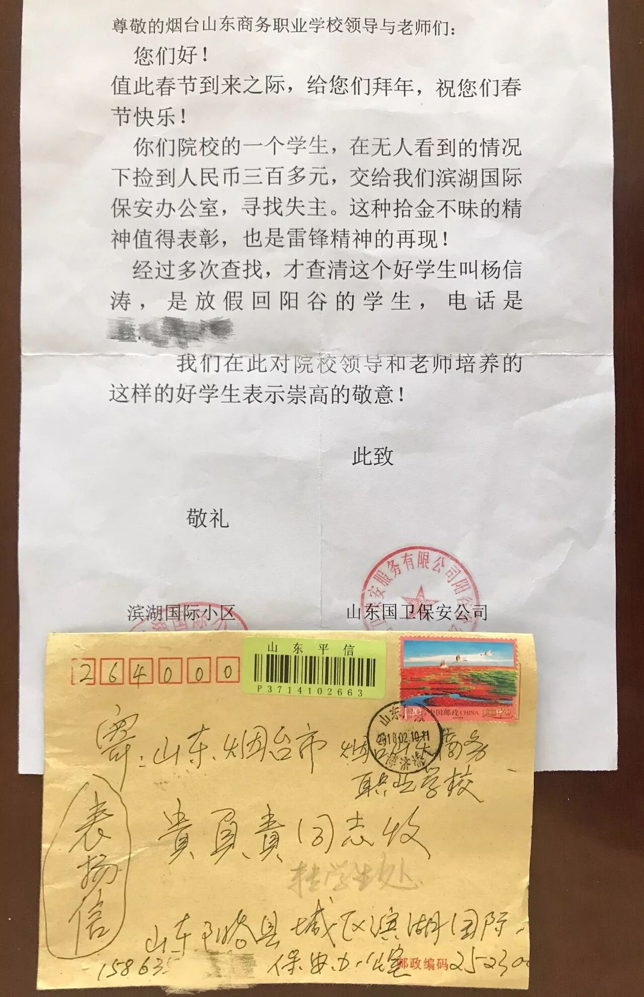 3月5日,在山东商务职业学院雷锋月启动的第一天,学校收到了来自山东阳谷的一封表扬信,信中山东国卫保安公司对学校经济管理系商贷二班的杨信涛同学捡300元现金拾金不昧的事迹提出了表扬。滨湖国际小区相关的负责人表示,虽然钱不多,更能反映咱们学生的素质高。