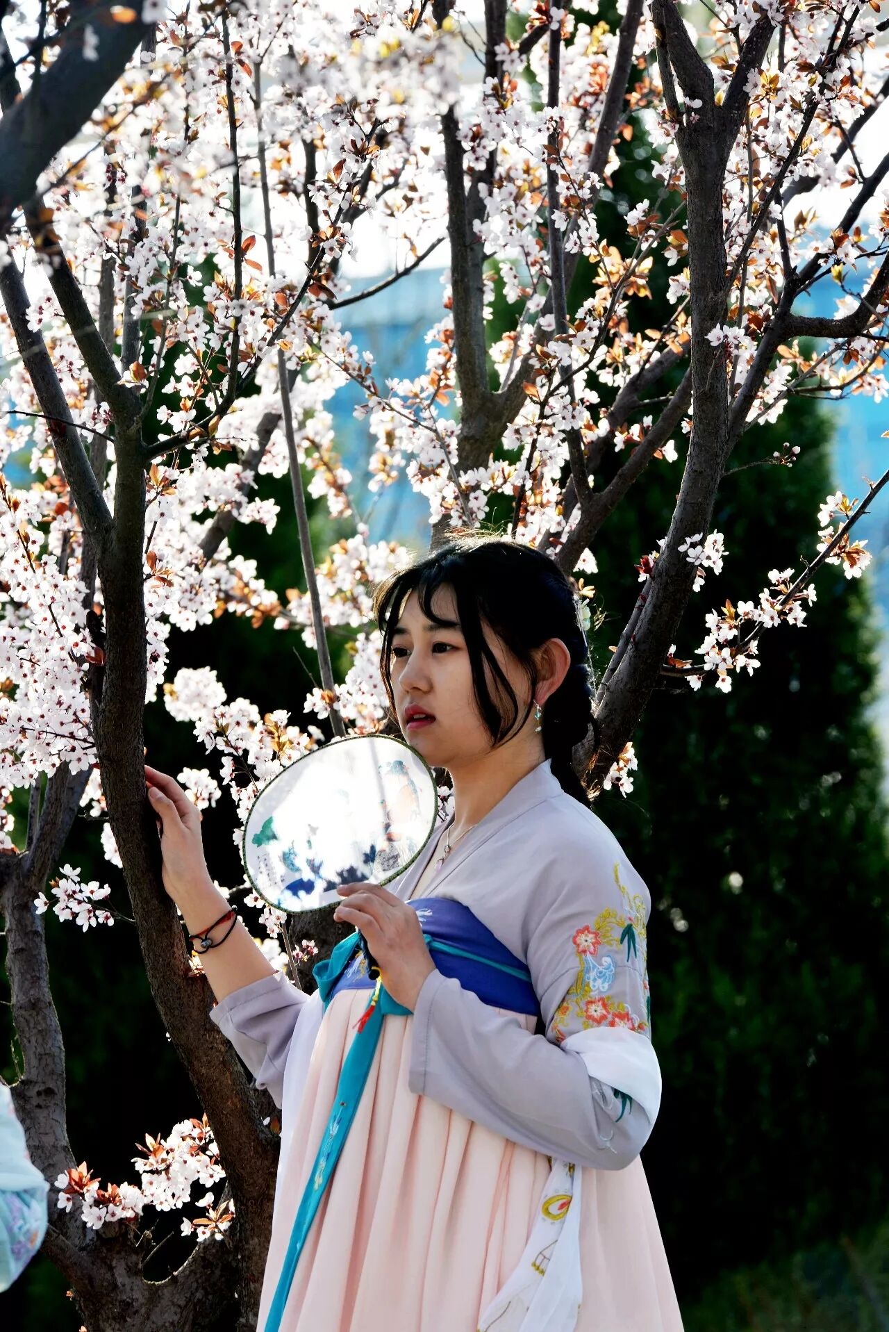 本站讯 4月17日,春天里的山东商务职业学院校园花团锦簇、弥漫花香。不过比花儿更吸引人的是一群正值妙龄的姑娘。她们身着不同形制的汉服,梳着结鬟,衣袂飘飘的走在师生中间。原来,这是该校青青子衿汉服文化社团在为农历三月三(4月18日)上巳节的宣传进行拍摄。