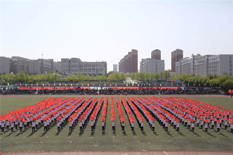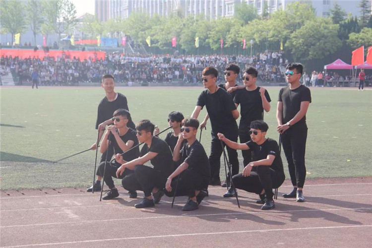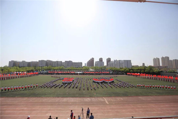 团体操表演以狮子舞开场,再现了我们商务人不屈不挠、奔腾争跃、喜气祥和的精神面貌。由信息艺术系、机电工程系、食品工程系三个系共800名同学带来的团体操表演动作整齐划一,节奏感强烈,让人眼前一亮:800名同学沐浴明媚的春光,迎着欢快的音乐,他们手持火红的扇子,奔向操场的中央,翻飞舞动的扇子抒发着生命的喜悦,舒展大方的动作洋溢着生命的欢快。运动场上,他们组成的九道方阵,恰似彩色的海洋,一个个充满青春活力的青年挥动着彩扇,熠熠生辉。表演队伍变成了大花园的图案,寓意“渊源共生,和谐共融”,预示着我们学校更加辉煌!圆中圆,大同心圆,围绕不变的中心点,串成九个同心圆,是希望、拼搏、勇气、守望,把我们的奋力拼搏的心串联在一起,串成梦想之圆。随后,表演队伍变换出“十九大”以及“S””W”的图案,寓意我们山东商务职业学院在党的十九大的光辉指引下,在学校党委的正确领导下,一定会魅力四射,奏响高职院校最强音!