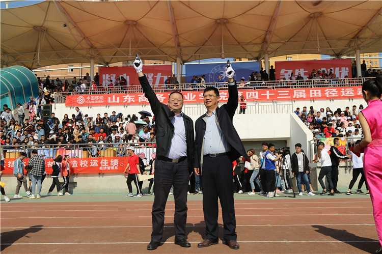本站讯 5月10日至5月11日,以“凝心聚力、争先创优”为主题的第四十三届田径运动会在我校体育场召开。学校领导耿建敏、杨新春、刘艳蔚、陶传蔚、王伟存、张云生等出席了开幕式和闭幕式。中国银行烟台分行副行长李爱东同志应邀出席本次运动会开幕式。开、闭幕式由副书记刘艳蔚主持。全体师生员工参加开幕式。学校党委书记耿建敏与李爱东副行长为本次运动会鸣第一枪。