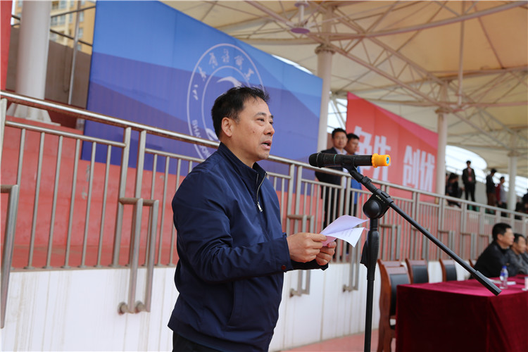 杨新春院长在开幕式上致辞。他首先代表学校及运动会组委会,向本届运动会的胜利开幕表示热烈的祝贺。向精心筹备本次赛会的所有工作人员表示诚挚的谢意。向积极参赛的运动员以及辛勤付出的裁判员表示亲切的慰问。他指出,本届运动会以“凝心聚力,争先创优”为主题,将全面展示出我校上下全力争创优质高职院校的良好精神面貌。学校体育工作是实现“健康中国”的有力保障和基础性工程,蕴含着健康与教育两大国家战略,具有极其重要的意义。他提到,过去的一年里,我校学子积极参加全国全省各类体育竞赛,成绩斐然,2017年,在“全国大学生武术散打锦标赛”中,张书宽同学斩获80公斤级铜牌,实现我校参加全国体育赛事的开门红。在全省大中小学生体育联赛乒乓球比赛中,我校共获得1枚金牌、2枚银牌、1枚铜牌,同时斩获女子团体金牌、男子团体铜牌。在全省大学生田径锦标赛中,我校也创下了4金7银5铜的优异成绩。在其他全省大学生排球、篮球联赛中,我校同样名列前茅,表现突出。他希望,各位参赛运动员充分发扬顽强拼搏、不怕困难的体育精神,坚持“友谊第一,比赛第二”的原则,规范参赛、文明参赛,赛出水平、赛出风格;希望所有裁判员同志秉承“公平、公正”的准则,恪尽职守,认真履行岗位职责;同时希望全体同学遵守大会纪律,做文明观众,各系部、班级要加强管理,做好后勤服务工作,共同营造热烈和谐的赛场氛围。最后,他预祝所有参赛运动员们能够突破自我、创造佳绩。预祝本届田径运动会取得圆满成功!