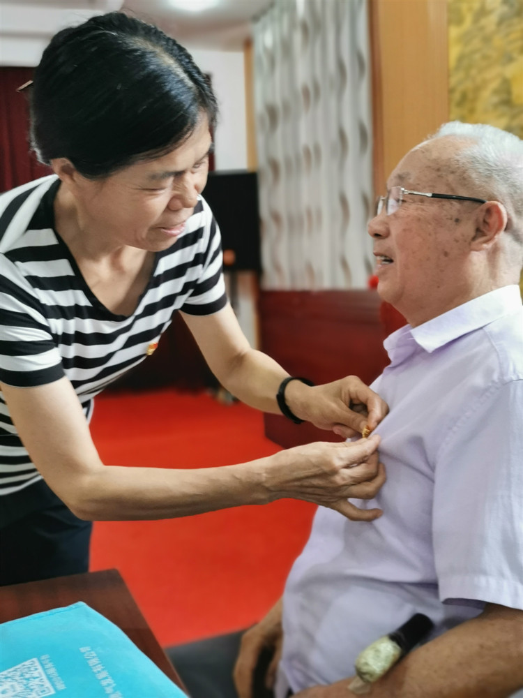 年轻党员为老党员佩戴党徽