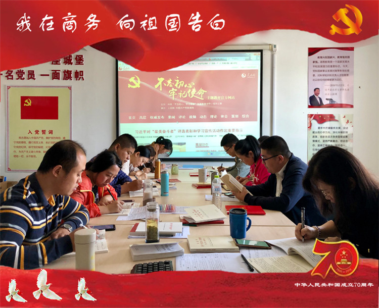 本站讯 为热烈庆祝中华人民共和国成立70周年,结合开展“不忘初心、牢记使命”主题教育工作,机关第八支部紧密结合工作实际,开展主题为“我在商务,向祖国告白”的特色庆祝活动,弘扬爱国精神,向祖国母亲真情告白,表达自己的赤诚之心。支部向下设部门的全体党员和教师发起号召:坚守工作岗位,服务师生,尽职尽责履行岗位职责。教务处、成人教育处、教师发展中心全体党员及教师在完成业务工作的同时不忘开展学习,纷纷在各自的工作岗位上向祖国母亲表白。