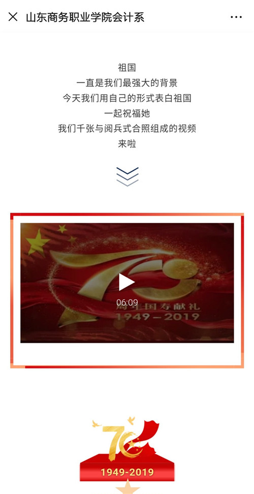 阅兵式结束后,累计收到1000多张合影照片,会计系青年媒体部将照片剪辑成视频《祖国,这是我们的告白》,并在学校各大平台播出,得到观众的普遍好评,截至目前点击量超过一万多次,刷新本月短视频观看新高。