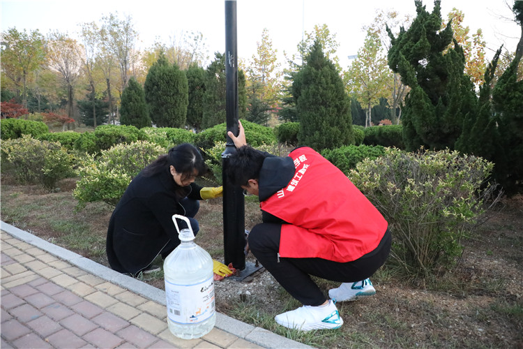 10月22日下午,支部全体党员自备水桶、水盆、抹布、扫帚等工具,带领“红色引领、结对帮扶”班级——建筑工程系2018级市政班同学,开展清洁青年湖环境卫生活动。师生们仔细擦拭“解字说粮”宣传栏、路边标识牌、警示牌、路灯灯柱,清洗“阳光”雕塑台,清理花坛路边杂草、捡拾草丛中的垃圾,党员们边劳动边与同学们交谈,为大赛做贡献的喜悦洋溢在心间眉梢,喜迎大赛的饱满热情体现在点滴行动中。