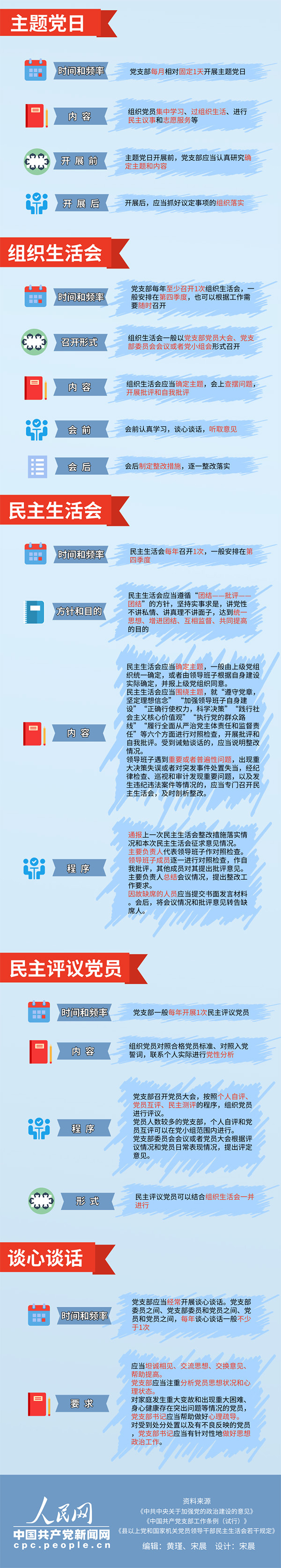 每月召开一次,由党小组组长主持。主要内容是:1、学习上级组织有关文件精神和党报、党刊及其他相关材料,学习先进党员的模范事迹等;2、汇报党员个人思想和工作情况,分析本小组党员和群众思想状况,开展批评与自我批评;3、研究积极分子的培养和教育情况以及党员发展、转正情况;4、改选小组长、酝酿支委候选人和出席上级党代会的代表候选人;5、评选优秀党员、讨论对党员的处分及党务方面的工作等。