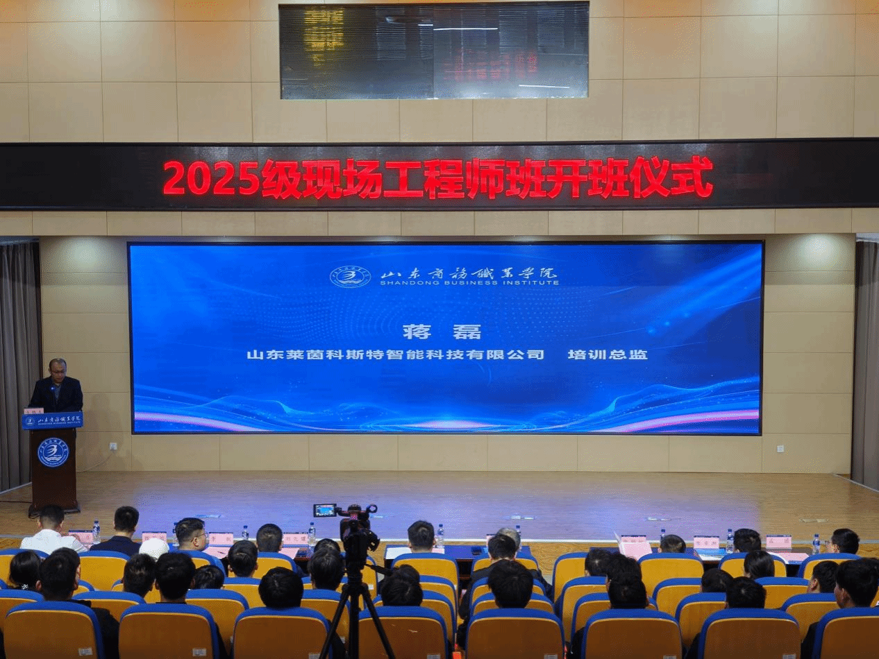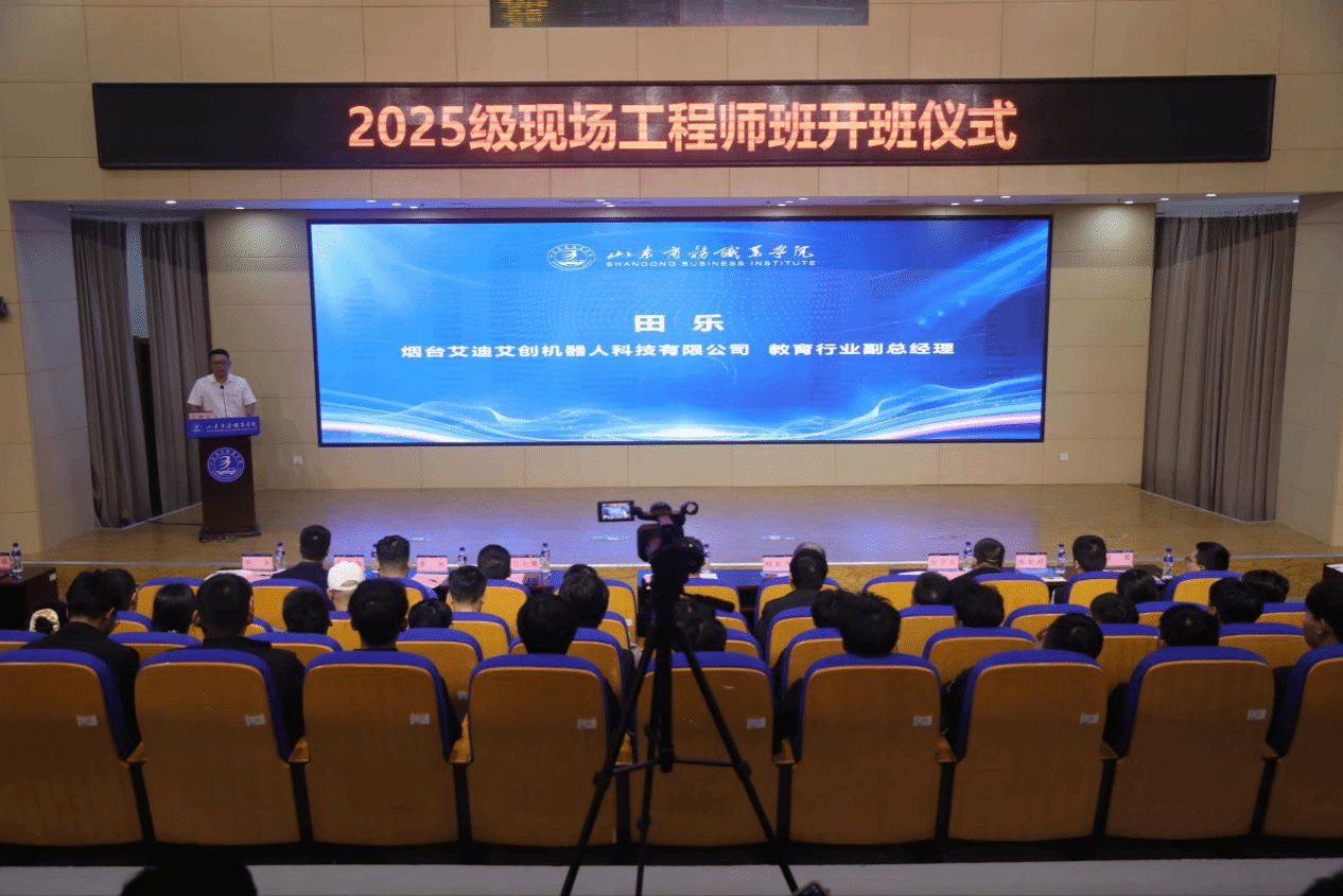 企业代表发言环节,山东莱茵科斯特智能科技有限公司培训总监蒋磊、烟台艾迪艾创机器人科技有限公司教育行业副总经理田乐分别结合行业发展趋势与企业用人需求,对学院校企协同育人模式给予高度评价。他们高度认可学院的校企协同育人模式,认为现场工程师班不仅是校企资源共享、优势互补的实践平台,更是实现产学研用深度融合、锻造人才核心竞争力的关键路径,并勉励学生们在学习中锤炼实战能力,成长为行业亟须的技术技能人才。