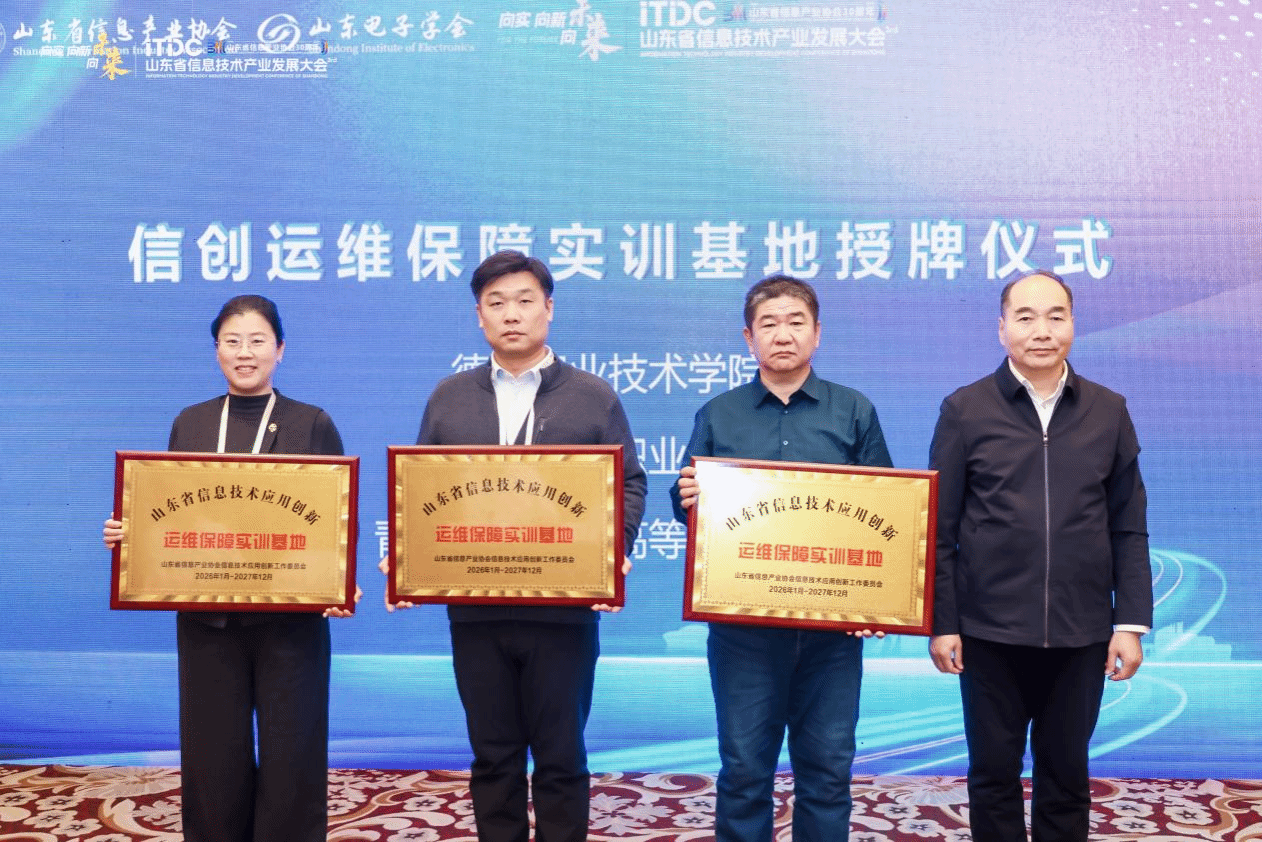 本站讯 12月19日,由山东省信息产业协会、山东电子学会联合主办的“信创产业生态发展大会”在德州召开。本次大会深度贯彻国家信息技术应用创新发展战略,聚焦信创产业生态构建、产教融合协同育人、运维保障服务体系建设等核心议题,汇聚政府部门、行业协会、龙头企业及院校代表共话产业高质量发展。我校受邀参会,凭借在信创领域的专业建设积淀与人才培养成效,成功获批“信创运维保障实训基地”并接受授牌。